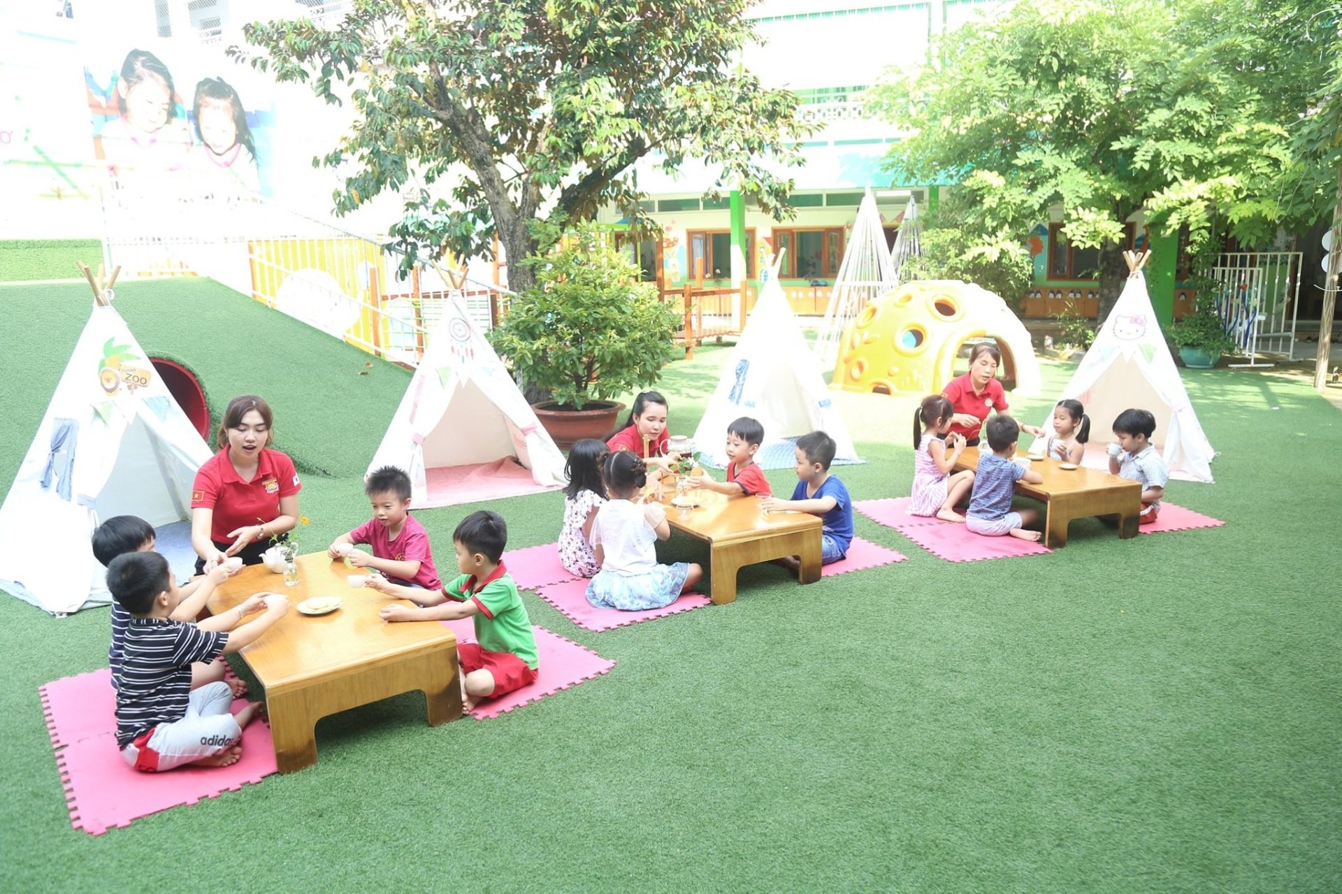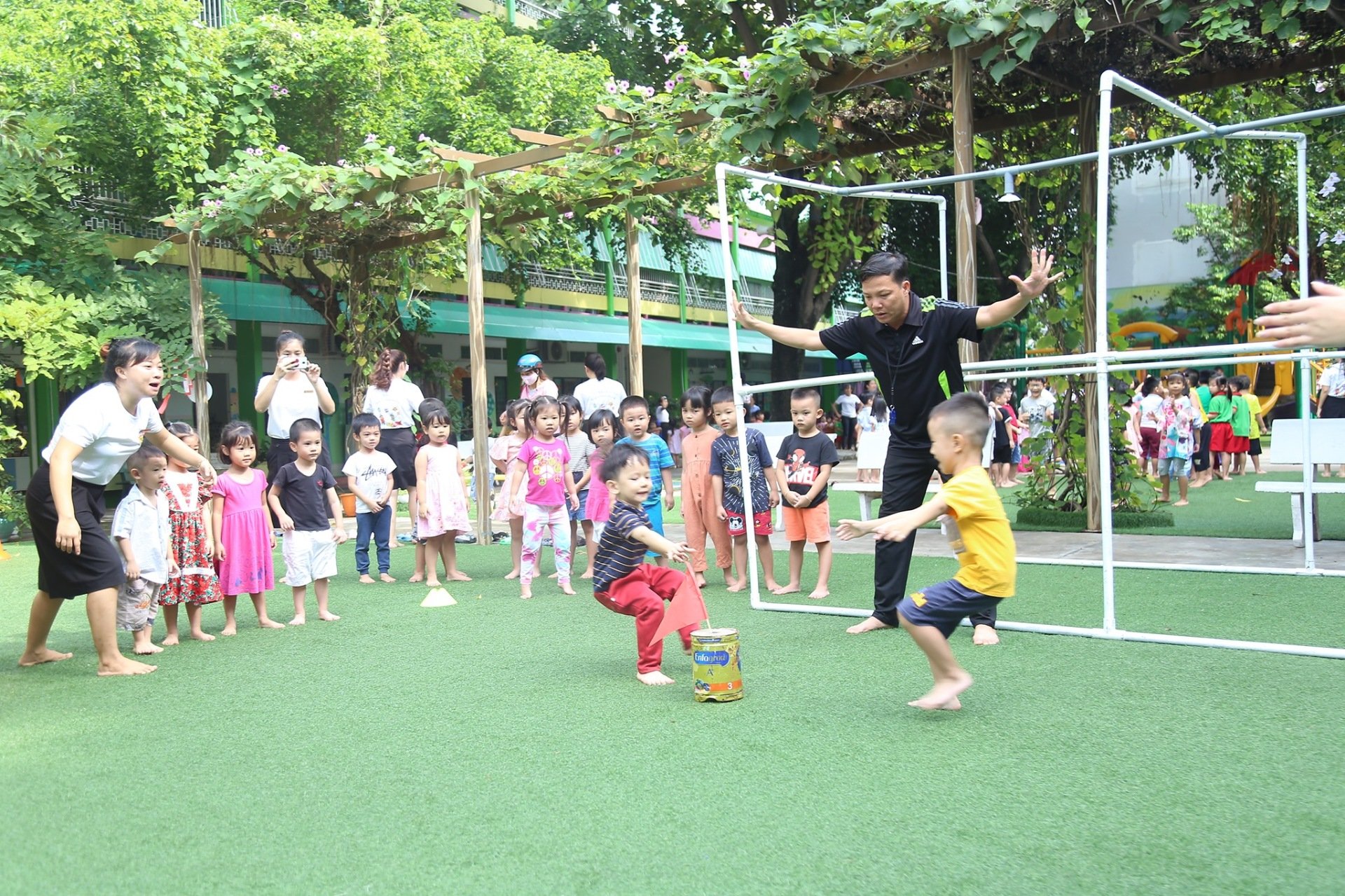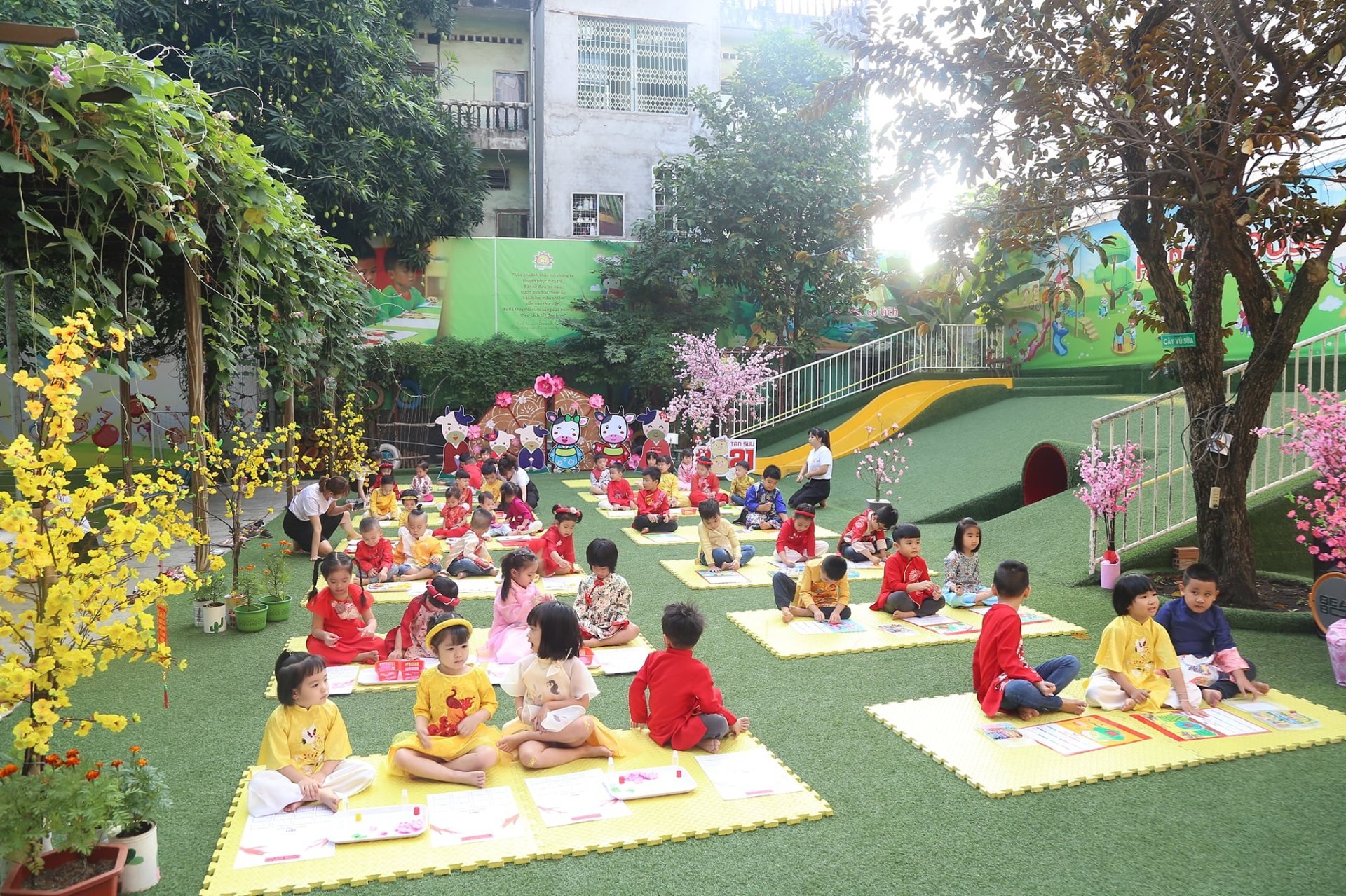 Không gian phòng học rộng rãi, sân trường nhiều cây xanh, trẻ được tham gia nhiều hoạt động ngoại khóa thú vị.